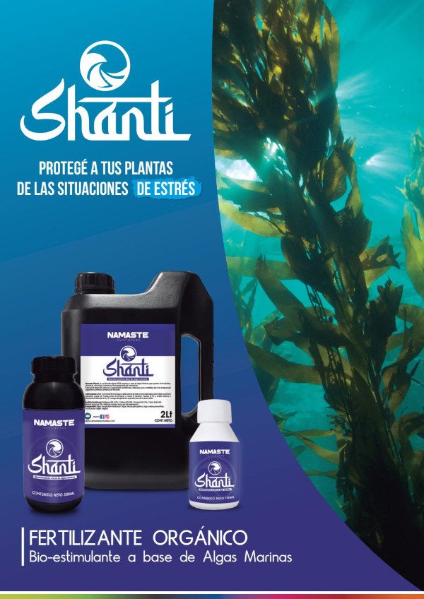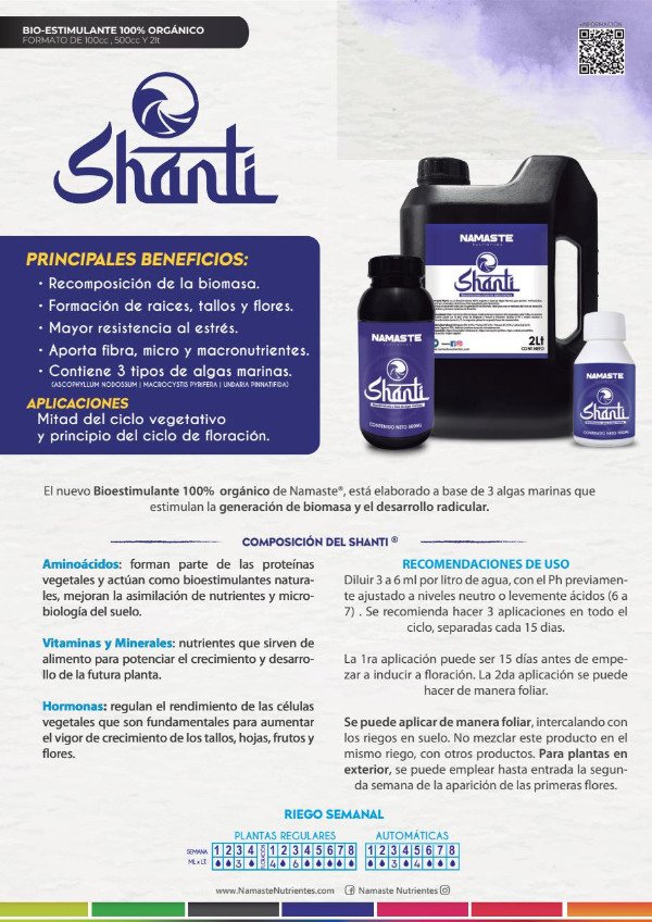 • Agregar de 3 a 6 ml de Shanti por litro de agua. Siendo 3 el mínimo y 6 el máximo a emplear; la primera aplicación puede ser 3 ml, la segunda 6 ml y el resto ir regulando según sustrato empleado. (tipos de sustrato: liviano, con turba, perlita, fibra de coco, entre otros.)