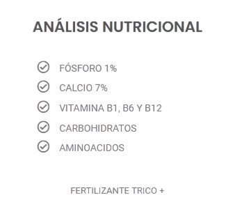 - Melaza deshidratada: Es la cristalización final del azúcar de caña, contiene sacarosa y sales tanto solubles como fermentables. La melaza es vital para el crecimiento y engorde saludable de una planta. También alimenta hongos y bacterias beneficiosos del suelo.